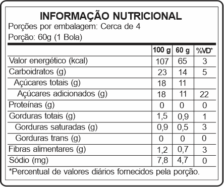 Ingredientes: Água, polpa de açaí, açúcar, dextrose, banana,emulsificantes (monoglicerídeos de ácidos graxos destilados, sal de ácidos graxos, monoestearato de sorbitana e polioxietileno de monoestearato de sorbitana), estabilizante (açúcar, amido, goma guar, carboximetilcelulose e goma tara),