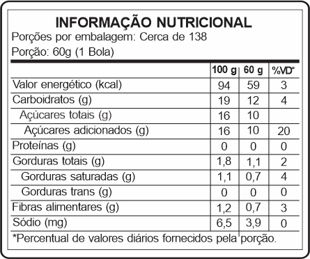 Sorbet sabor açaí: Água, polpa de açaí, açúcar, glucose, estabilizante,