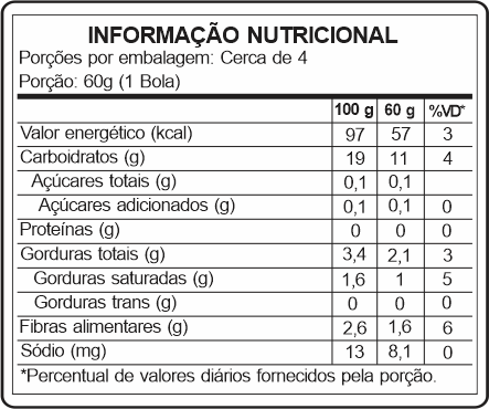Ingredientes: Água, polpa de açaí, base zero (maltodextrina, polidextrose, gordura vegetal, estabilizante sorbitol, maltitol, goma guar, goma jataí, goma xantana, ácido cítrico, carboximetilcelulose, monodiglicerídeos de ácidos graxos e sucralose) e emulsificante (água, monoglicerídeos de ácidos graxos destilados, sal de ácidos graxos, monoestearato de sorbitana e polioxietileno de monoestearato de sorbitana).